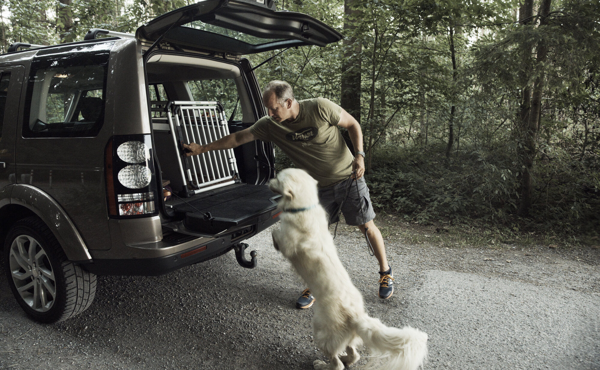 Es ist jetzt drei Jahre her, seit sich Eikamp und seine Frau, eine Kinderärztin, mit den beiden Kindern einen Hund zulegte. Seither kommen sie fast täglich in dieses Waldstück bei Cham, um mit Happy spazieren zu gehen. Die Box, die sich der Unternehmer für den Transport im Auto ausgesucht hat, ist ein Modell der Schweizer Marke 4pets. „Ich wollte einen Hundekäfig, der sicher und tierfreundlich ist, der nicht zu viel Platz beansprucht und den man problemlos ein- und ausladen kann“, erklärt Eikamp. Mit seinem Entscheid ist er bis heute zufrieden. Er zeigt auf das Gehäuse mit den Aluminiumrohren, das sich auch optisch ins Gesamtbild seines Wagens fügt und sagt: „Ich habe absolut nichts daran auszusetzen.“