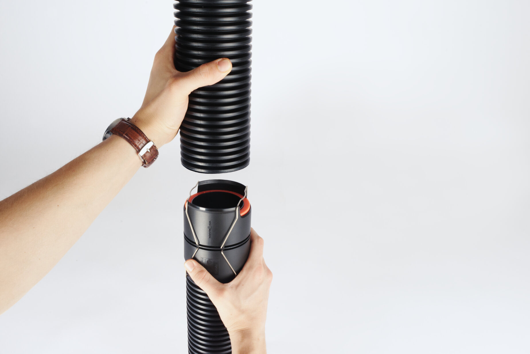 Ein Novum in der Branche: die Rohre werden einfach in die Verbindungsstücke gesteckt, anstatt - wie üblich - Dichtungen zu montieren, zu schmieren, zusammenzubauen und nachträglich zu sichern.