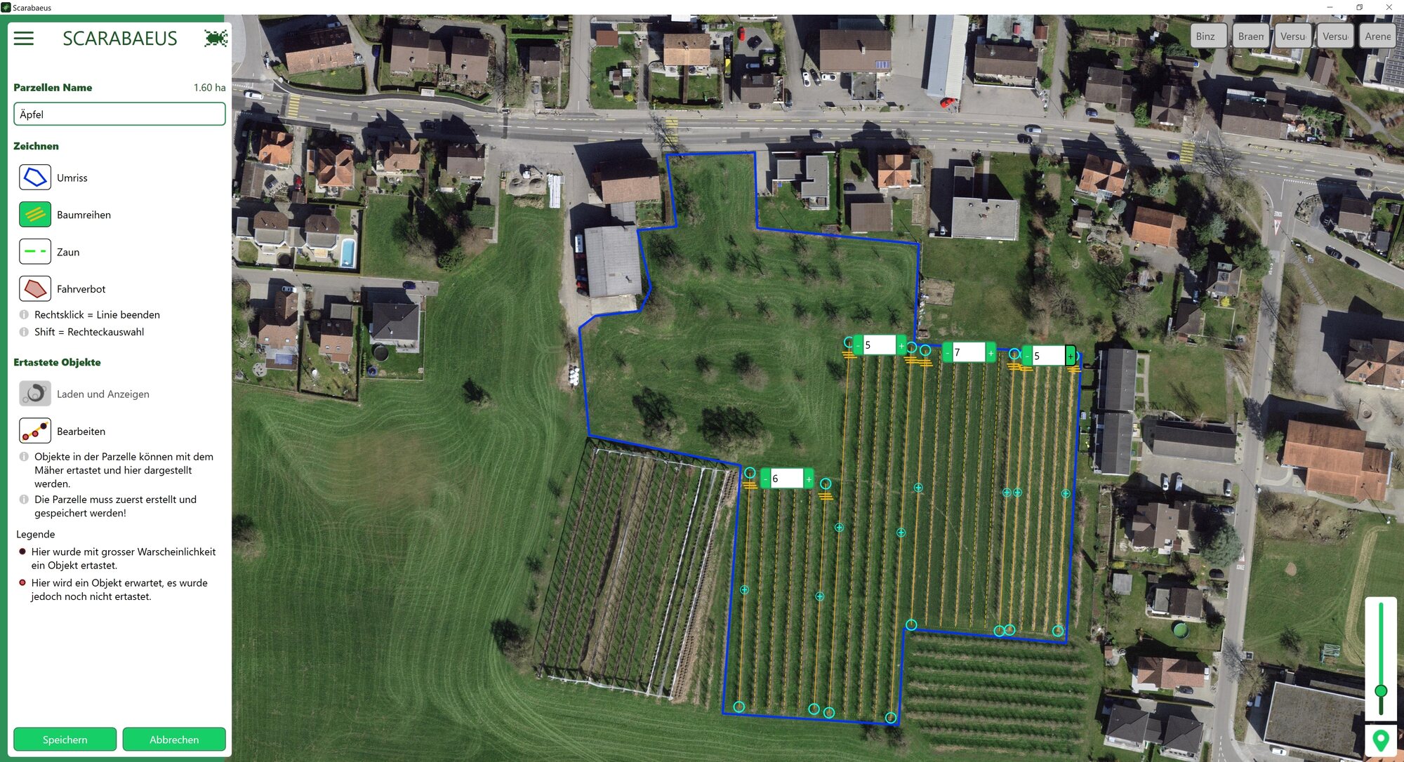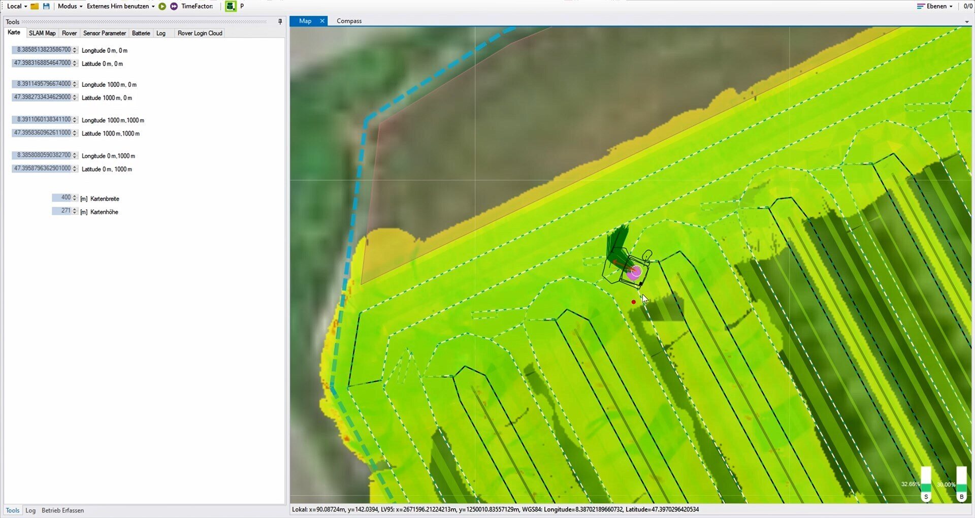 Scarabaeus arbeitet selbstständig in Obstplantagen. Die Anwender:innen bereiten dafür eine Map mit Aufgabengebieten vor, in die sich das autonome Fahrzeug einlernt und für sich verfeinert. Wir haben ein neuartiges Navigationssystem von Grund auf entwickelt, das eine Orientierung in der Obstplantage ohne visuelle Systeme möglich macht.