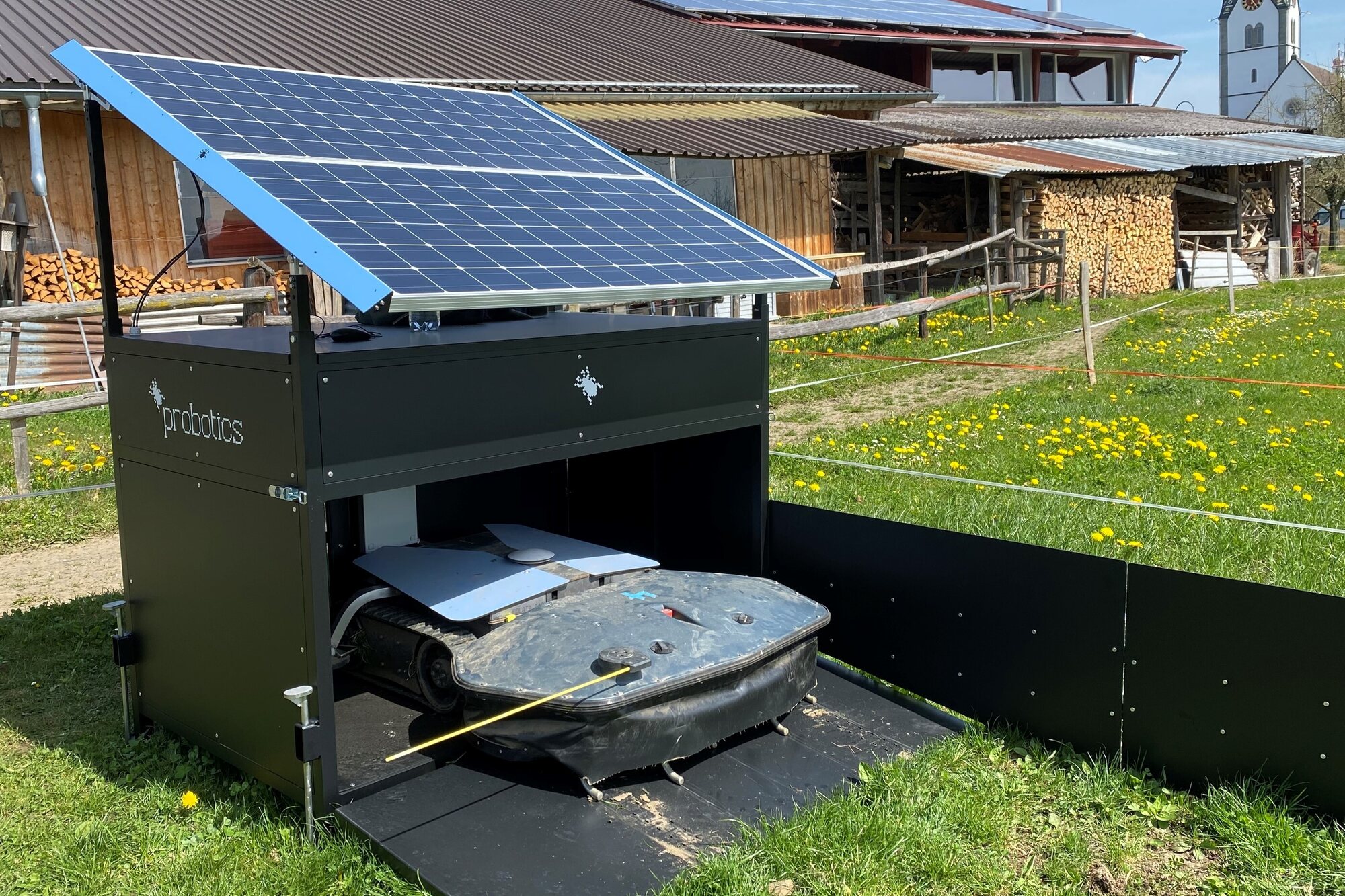 Scarabaeus mulcht Gras bis 15 cm Höhe im Dauerbetrieb – mit seinem Seitenmähwerk sogar in den engen Bereichen zwischen den Bäumen. Nach ca. dreieinhalb Stunden fährt er in seine Station, um zu laden.