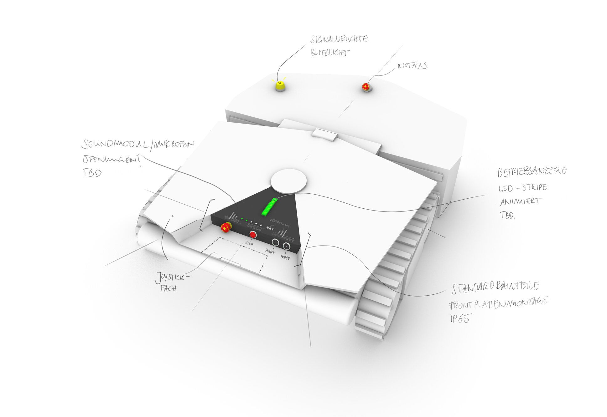 Das Design gab Scarabaeus seinen Namen, aber die käferartige Form ist kein blosser Marketinggag. Damit er seine Aufgabe wahrnehmen kann, muss er sich flach unter die Äste ducken. Ausserdem bringt die Formgebung den Charakter von Scarabaeus zur Geltung: Robust, kompetent und freundlich. Die klare Topologie mit frontalem Mähwerk und dem Fahrwerk dahinter ermöglicht ein ergonomisches und sicheres Produkt.