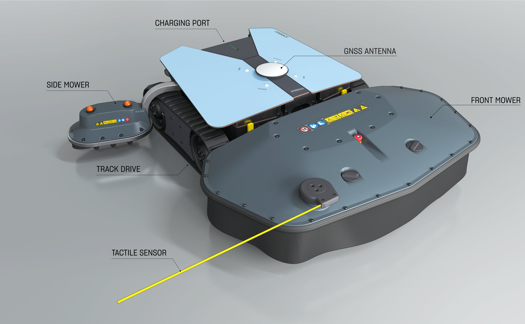 Das gesamte System fokussiert auf die Themen Nutzen, Sicherheit, Energieeffizienz und Zielkosten. Effizientes Mähen zwischen einzelnen Bäumen, auf grobem Untergrund, bei jedem Wetter, stellt sowohl an Mechanik wie Systemtechnik hohe Anforderungen und erfordert spezifische Lösungen.