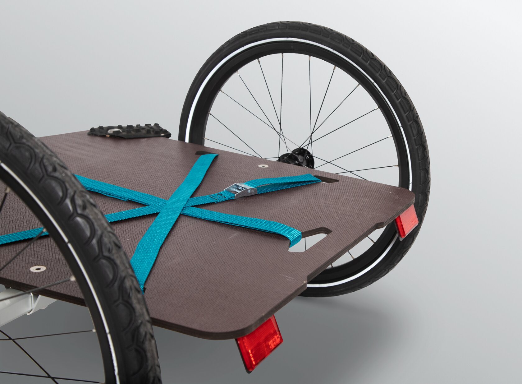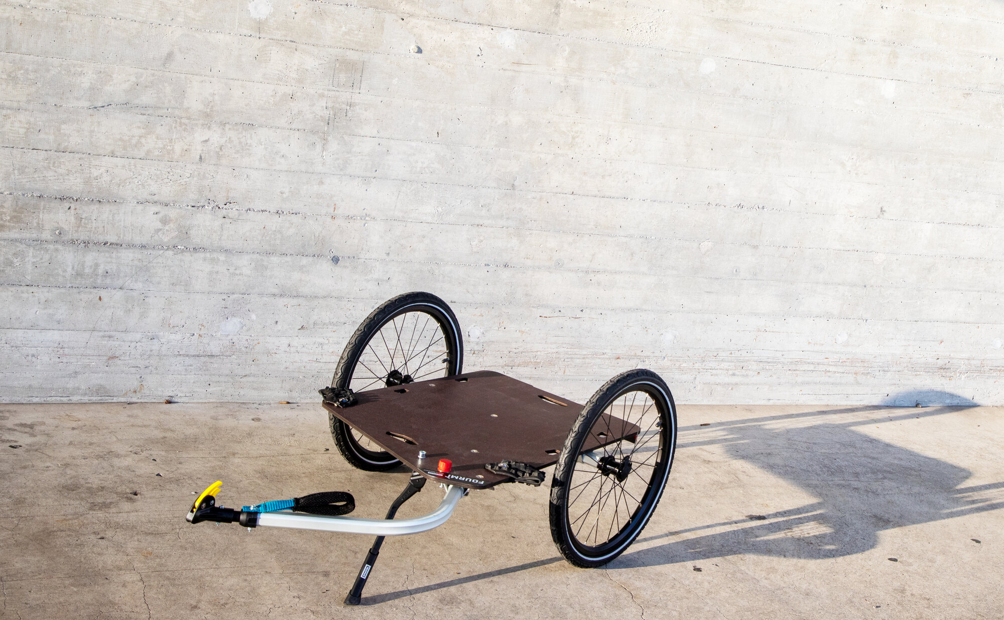 Fourmi can carry many times its own weight. The basis for the sleek trailer is a robust, weatherproof multiplex board with anti-slip surface. Cleverly placed cutouts in the transport plate offer many possibilities for attaching bags, folding boxes, aluminum or Rako crates easily and securely. The drawbar can be rotated 90 degrees, adding a hand cart mode to the bike trailer. The wooden base plate is complemented with wheel deflectors made from recycled tires. Thanks to quick-release axles, the wheels can be removed in seconds - reducing the trailer's stowage size to record-thin dimensions.